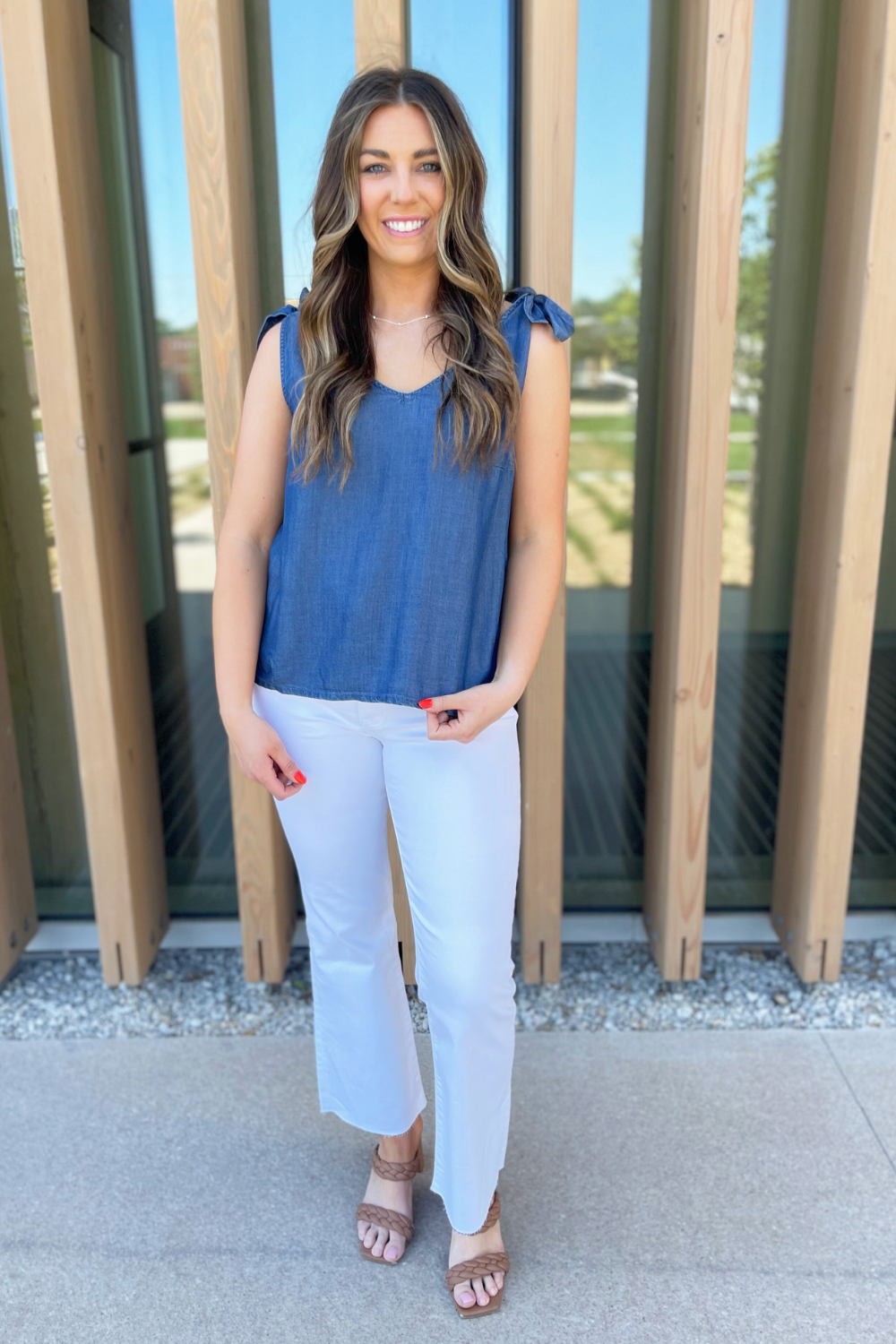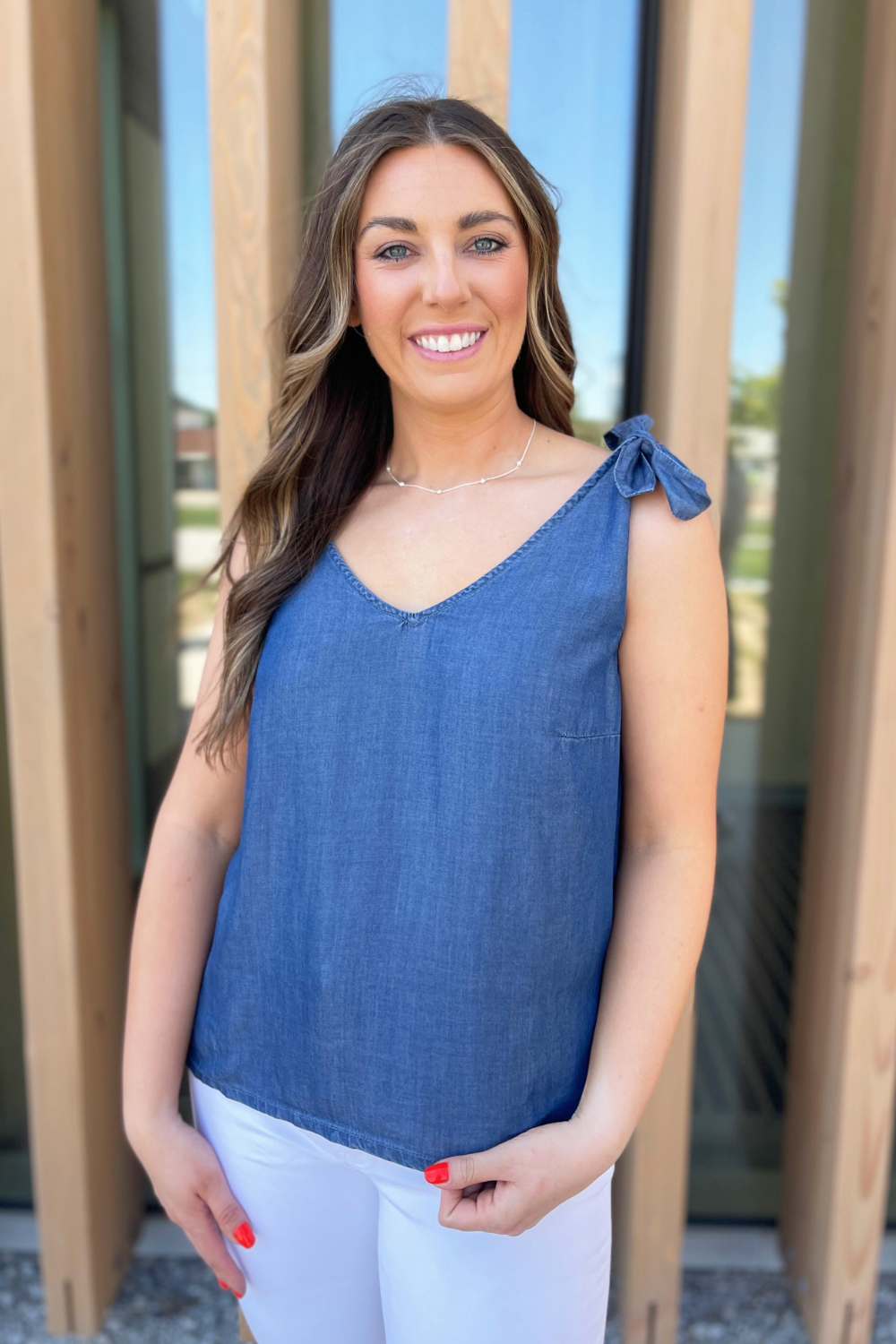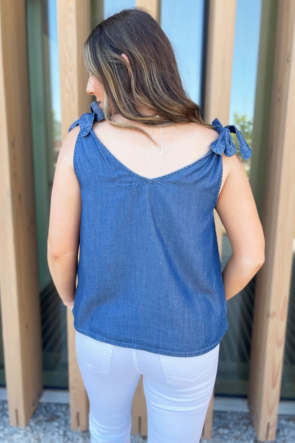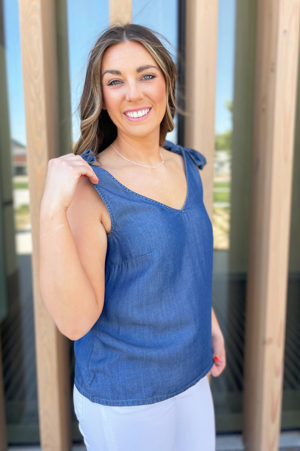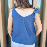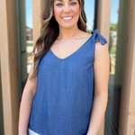The Tie Shoulder V-Neck Sleeveless Top is a must-have this season. This sleeveless top has a V neck in the front and back and a light denim finish. The adjustable knotted straps ensure the perfect fit. Wear this top with shorts or light denim for an easy casual outfit.