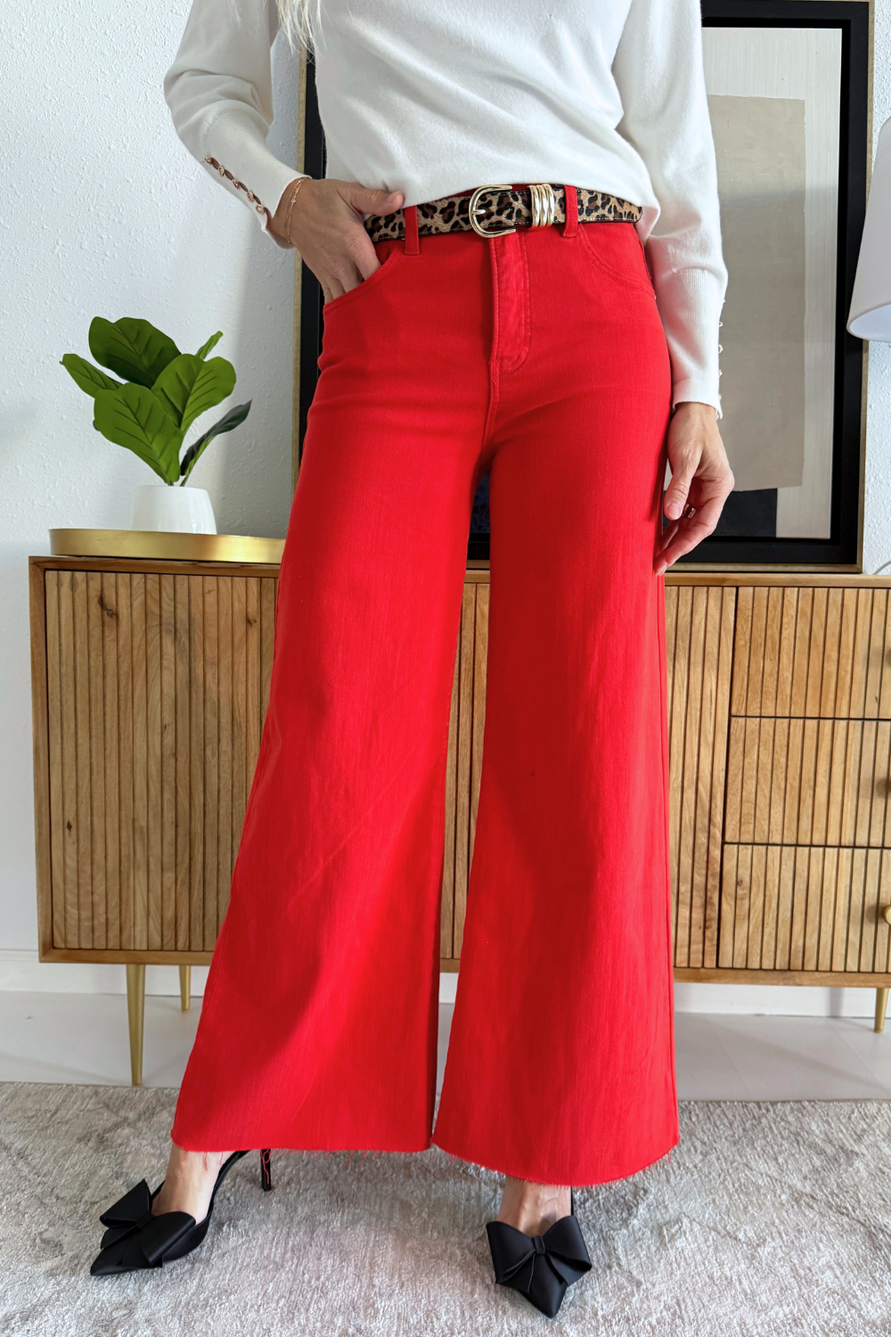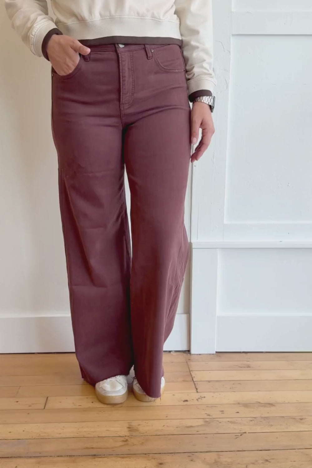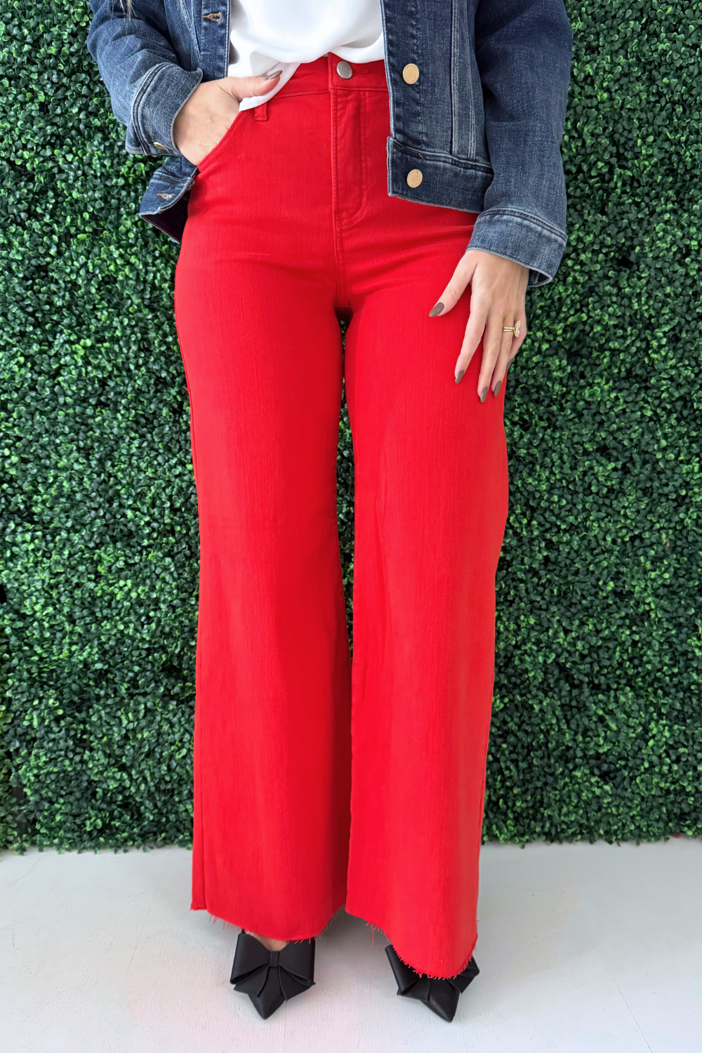 These high-rise wide leg jeans make a bold statement with their vibrant, eye-catching finish. Designed to sit comfortably at the waist, they offer a flattering silhouette that elongates the legs. The structured denim holds its shape while allowing for easy movement. Perfect for adding a pop of personality to any outfit!