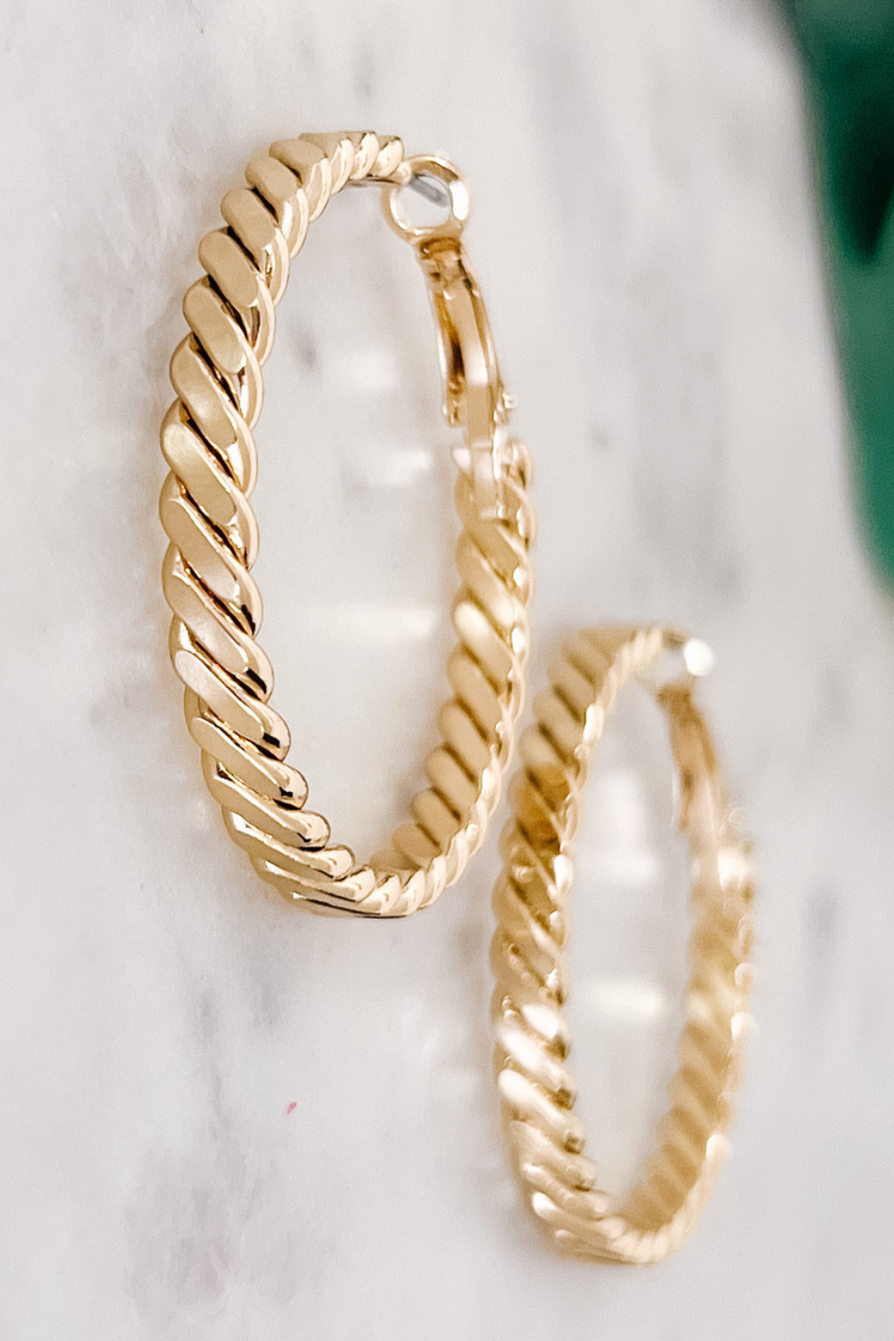 These sleek hoop earrings are the perfect addition to any look. Crafted in Gold or Silver, they are nickel and lead compliant and have a modern, twisted shape. Add a touch of sophistication to any outfit with these timeless pieces.