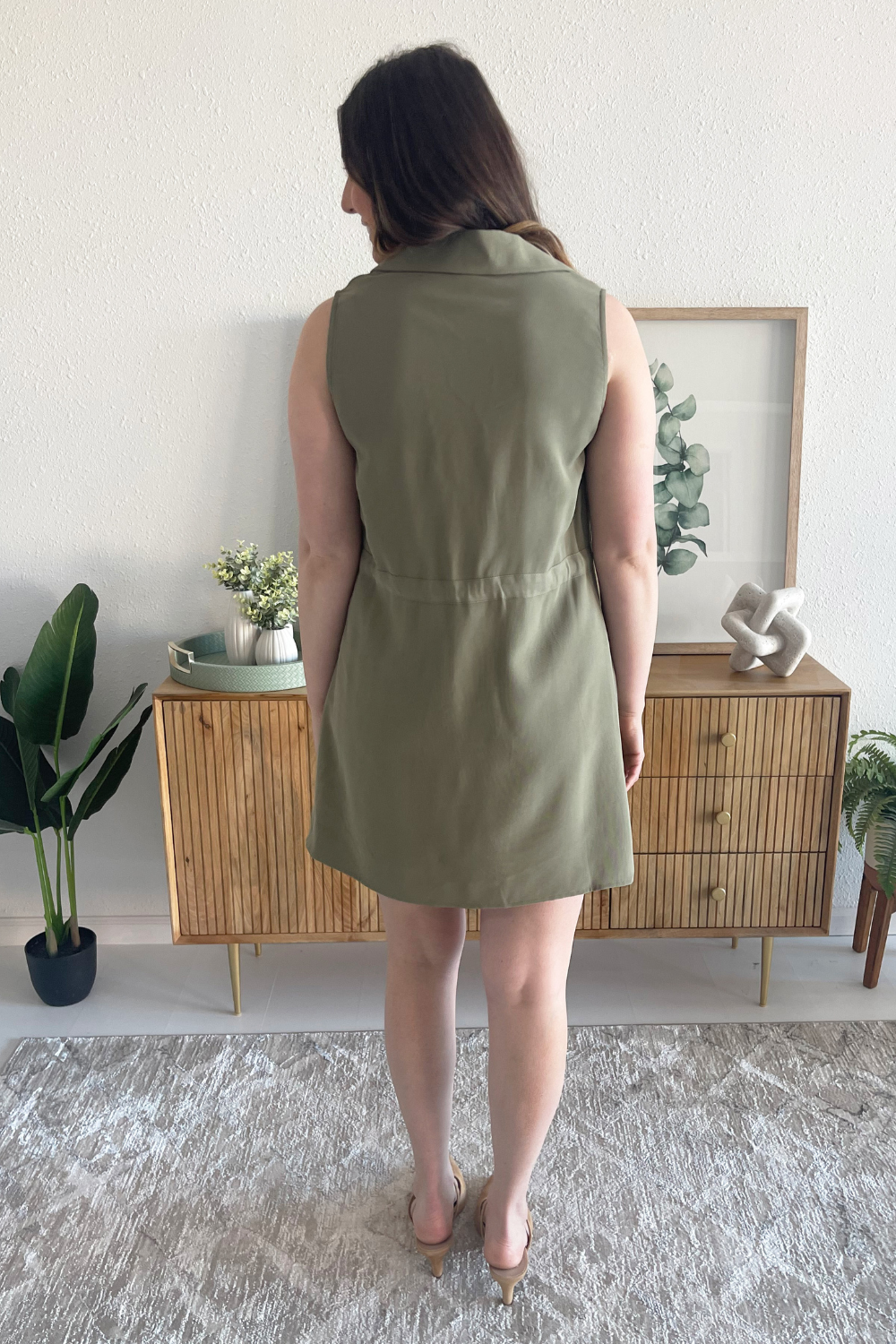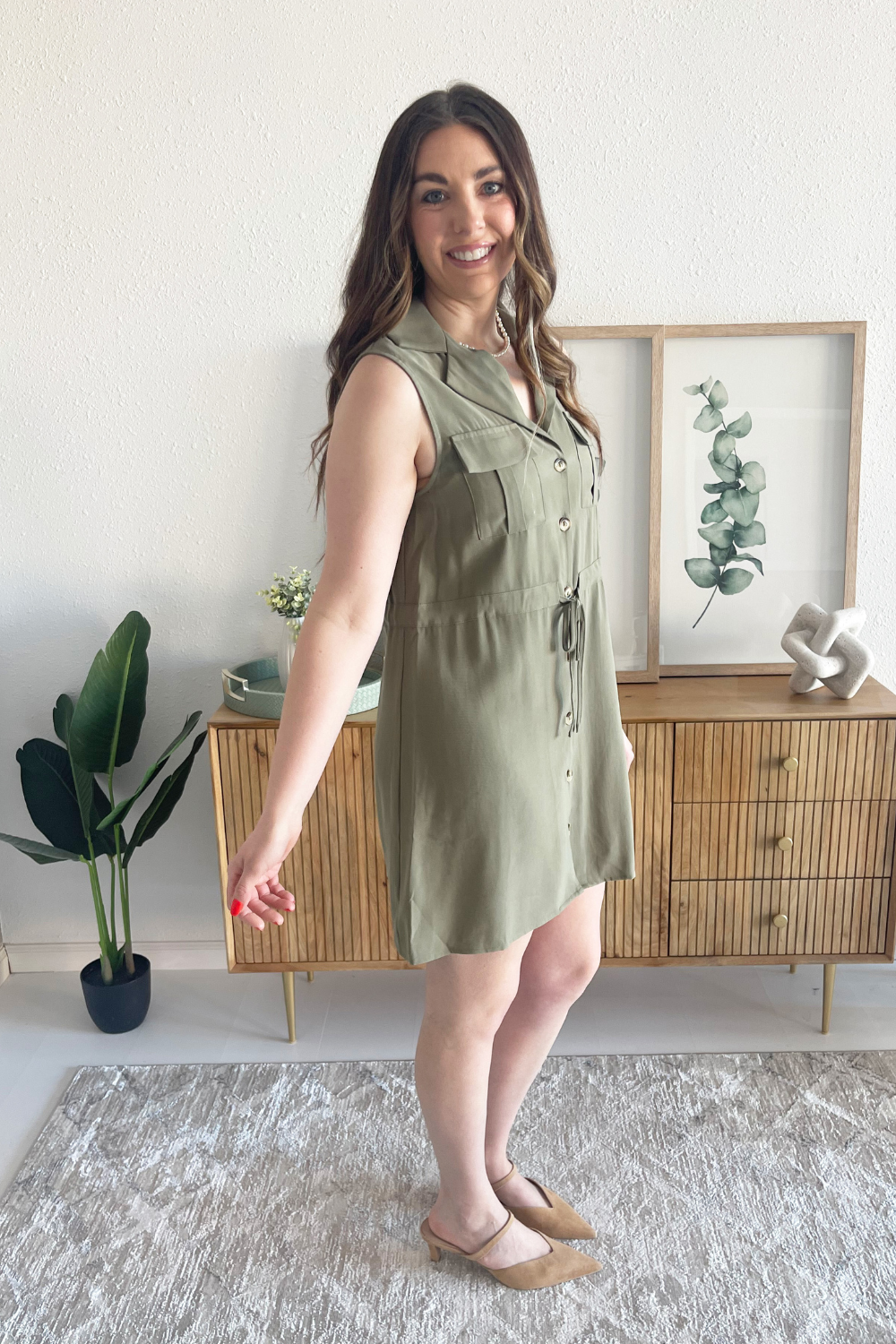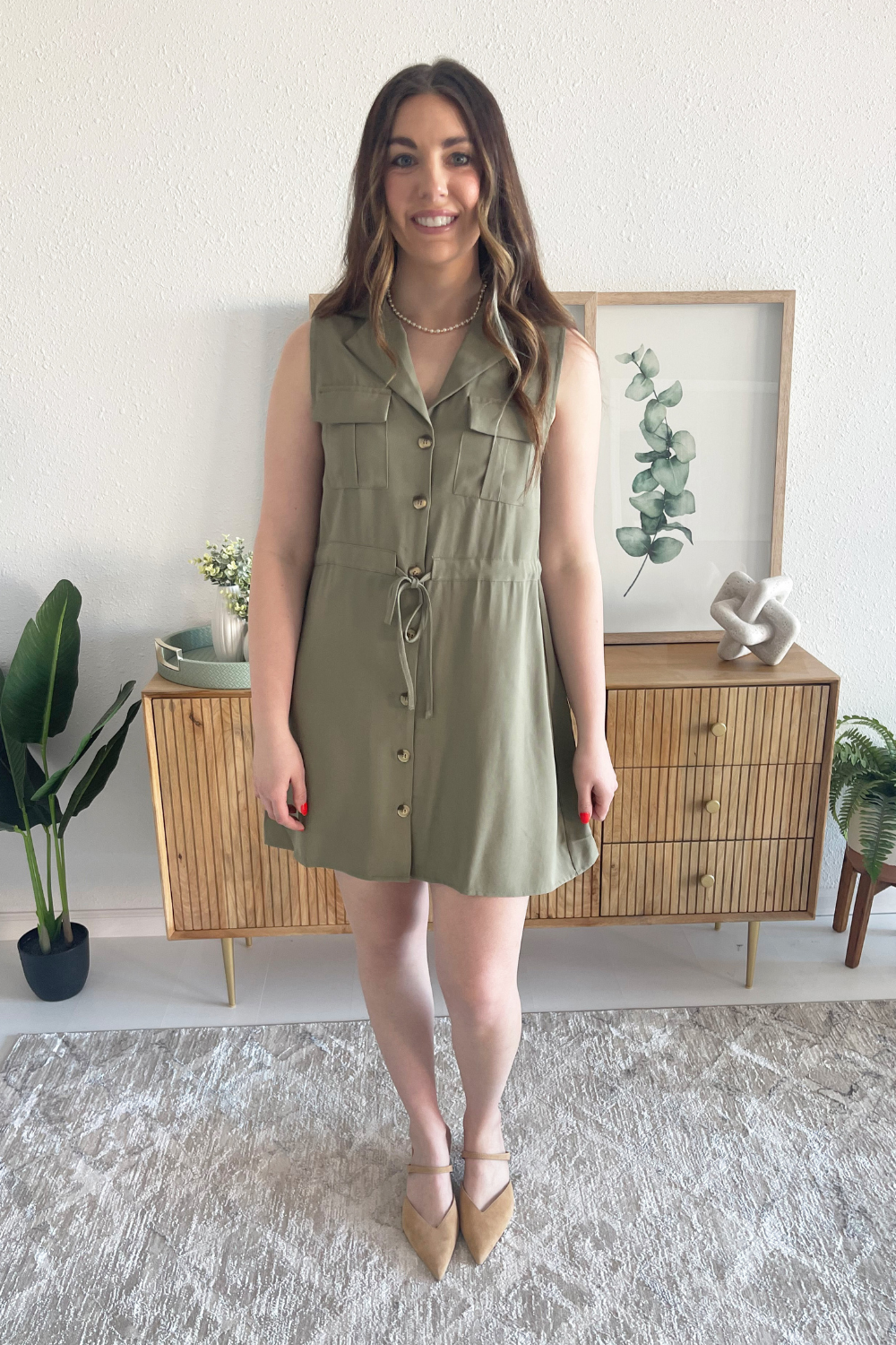 The Utility Tie Shirt dress is chic and effortless. This sleeveless dress is mini length, and has a V neck and button front. The drawstring waist ensures a flattering fit while the front chest pockets add a utility vibe. Add sandals or sneakers for an easy casual look.