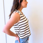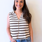 V Neck Button Front Striped Sleeveless Top This cream and brown striped sleeveless top features a flattering v-neckline with a button front design that gives it a classic, effortless look. The lightweight fabric and relaxed silhouette make it perfect for warm weather while still being easy to layer with jackets or cardigans. It pairs perfectly with denim, shorts, or trousers for a simple everyday outfit.