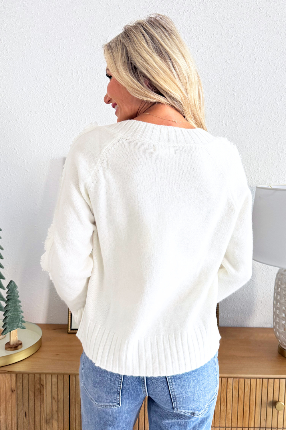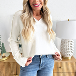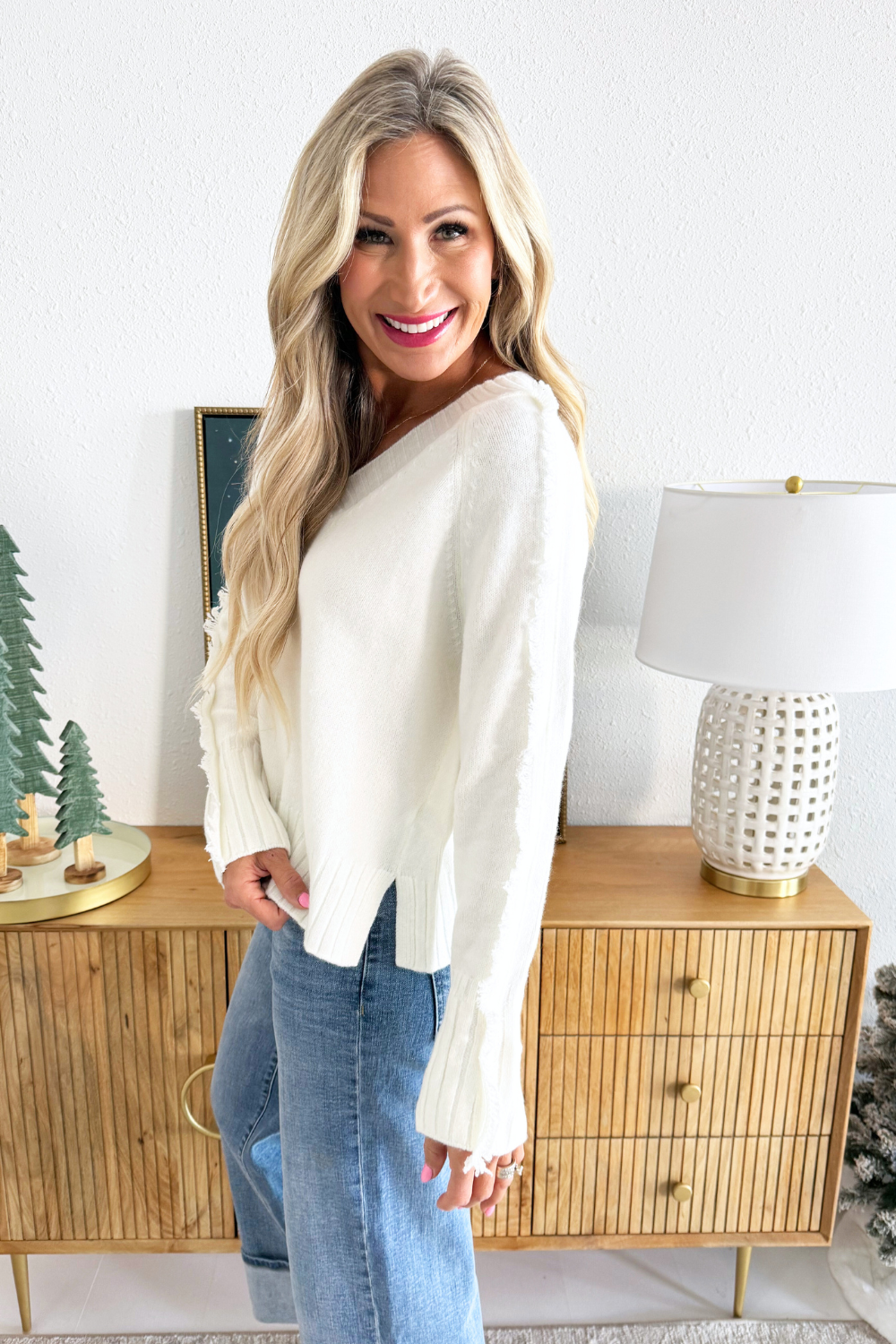 A fun twist on your basic white sweater, this v-neck fringe arm sweater has subtle fringe detailing on a super soft fabric. Pair back to skirts, trousers, or denim for endless styling options!