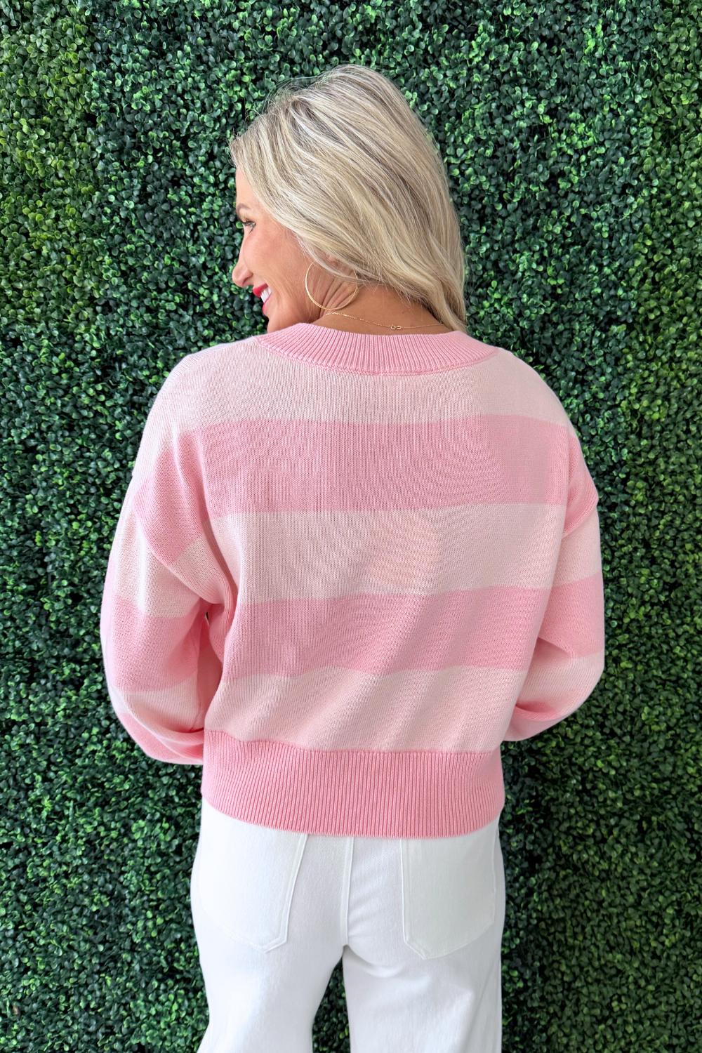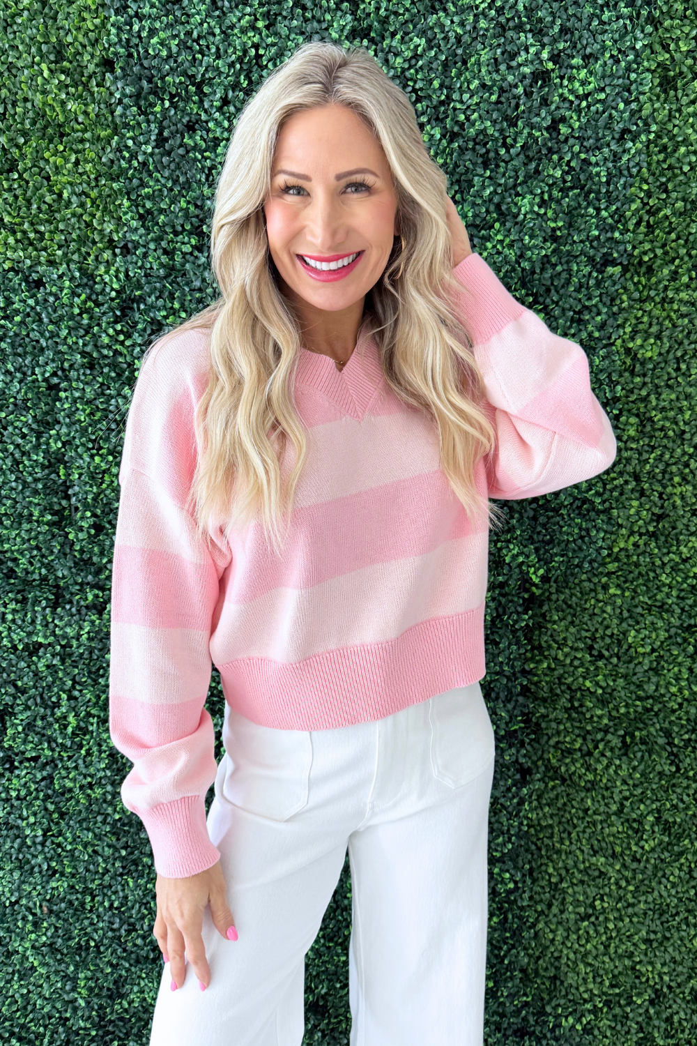 Soft, sweet, and effortlessly stylish. This pink v-neck striped sweater features a flattering neckline and classic stripe pattern for a timeless look. Made from a cozy, lightweight knit, it’s perfect for layering or wearing on its own. The relaxed fit offers all-day comfort while still feeling polished—easy to dress up with jeans and boots or keep casual with leggings and sneakers. A go-to piece for adding a pop of color to your everyday wardrobe.