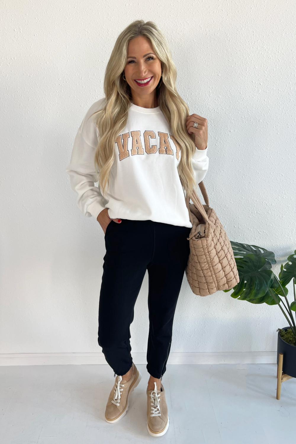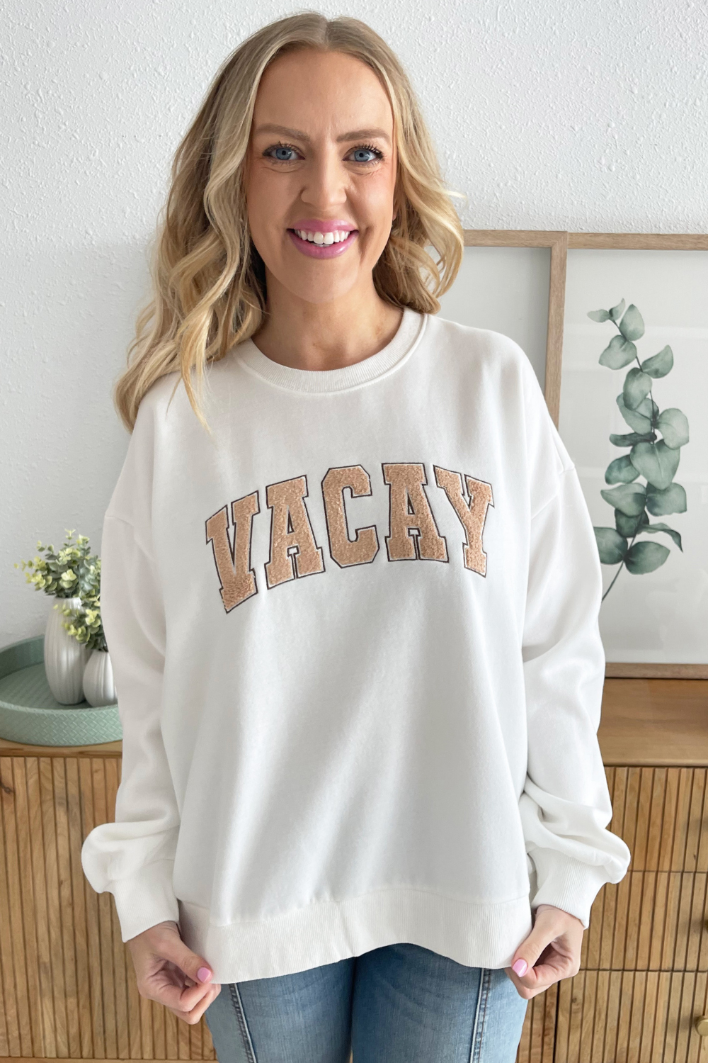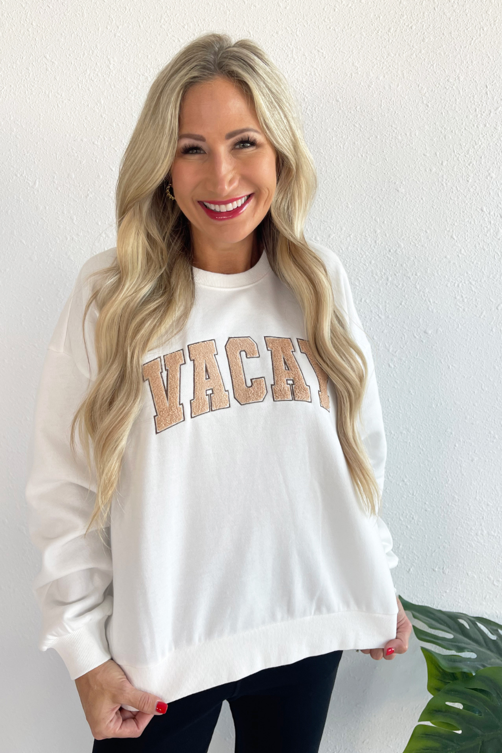 VACAY ALL DAY in the Vacay Patch Sweatshirt. Perfect for your next adventure or just lounging at home. The patch lettering gives the sweatshirt an elevated look and cozy feeling.