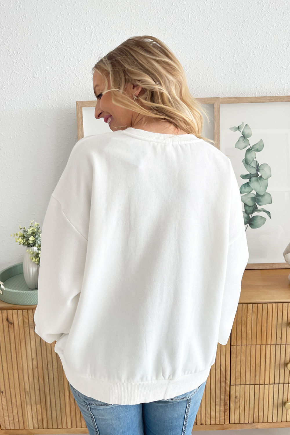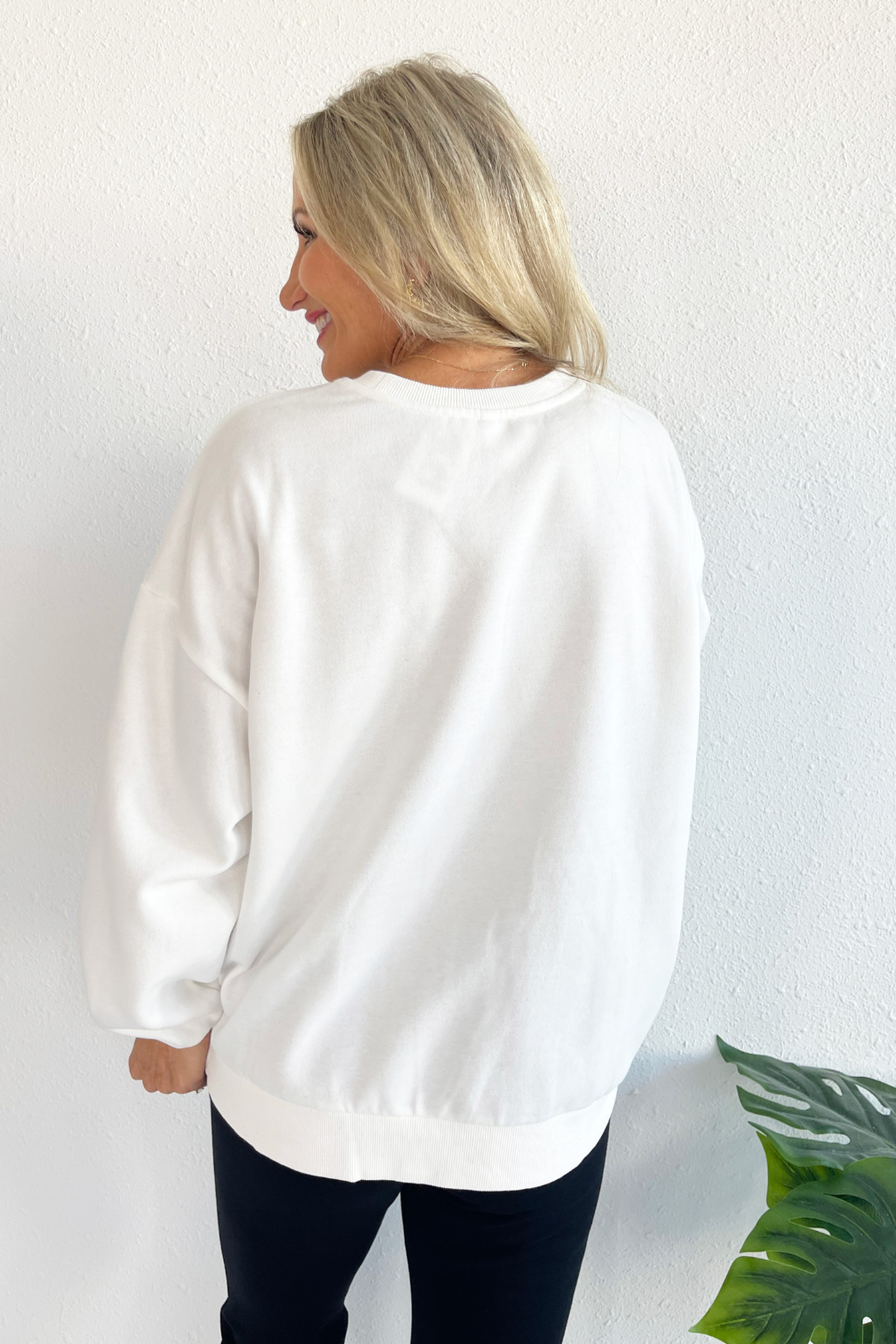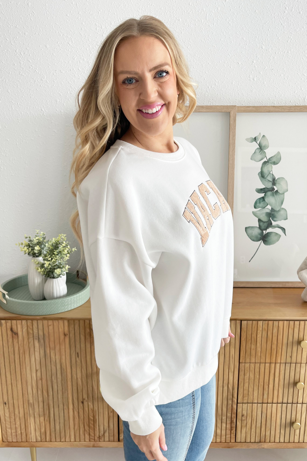 VACAY ALL DAY in the Vacay Patch Sweatshirt. Perfect for your next adventure or just lounging at home. The patch lettering gives the sweatshirt an elevated look and cozy feeling.