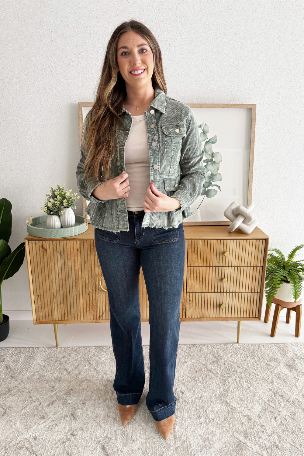 This washed denim peplum jacket brings a feminine edge to a classic staple. Featuring a cinched waist that flares into a soft peplum hem, it creates a flattering, structures silhouette with just the right amount of flair. Perfect for layering, this jacket effortlessly elevates both casual and dressed up looks.