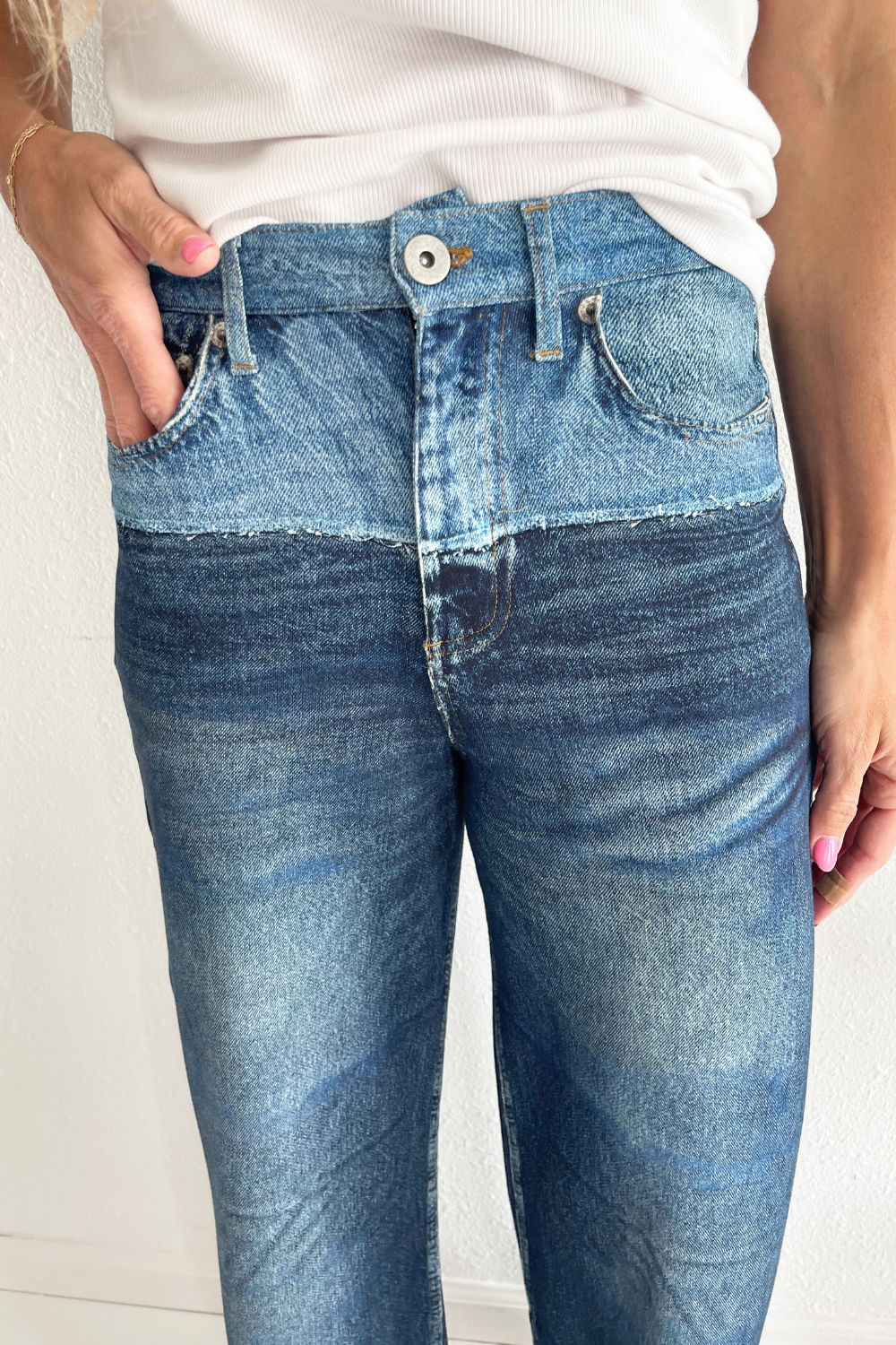 The Wide Leg 2 Tone Denim is sure to make a statement. This wide leg denim feels like sweatpants! It has a high rise, relaxed fit, and zip fly. The unique two tone design is screen printed and adds a stylish twist to your staple denim. The back pockets are also screen printed! Wear these with a basic tee for a classic, yet chic look.