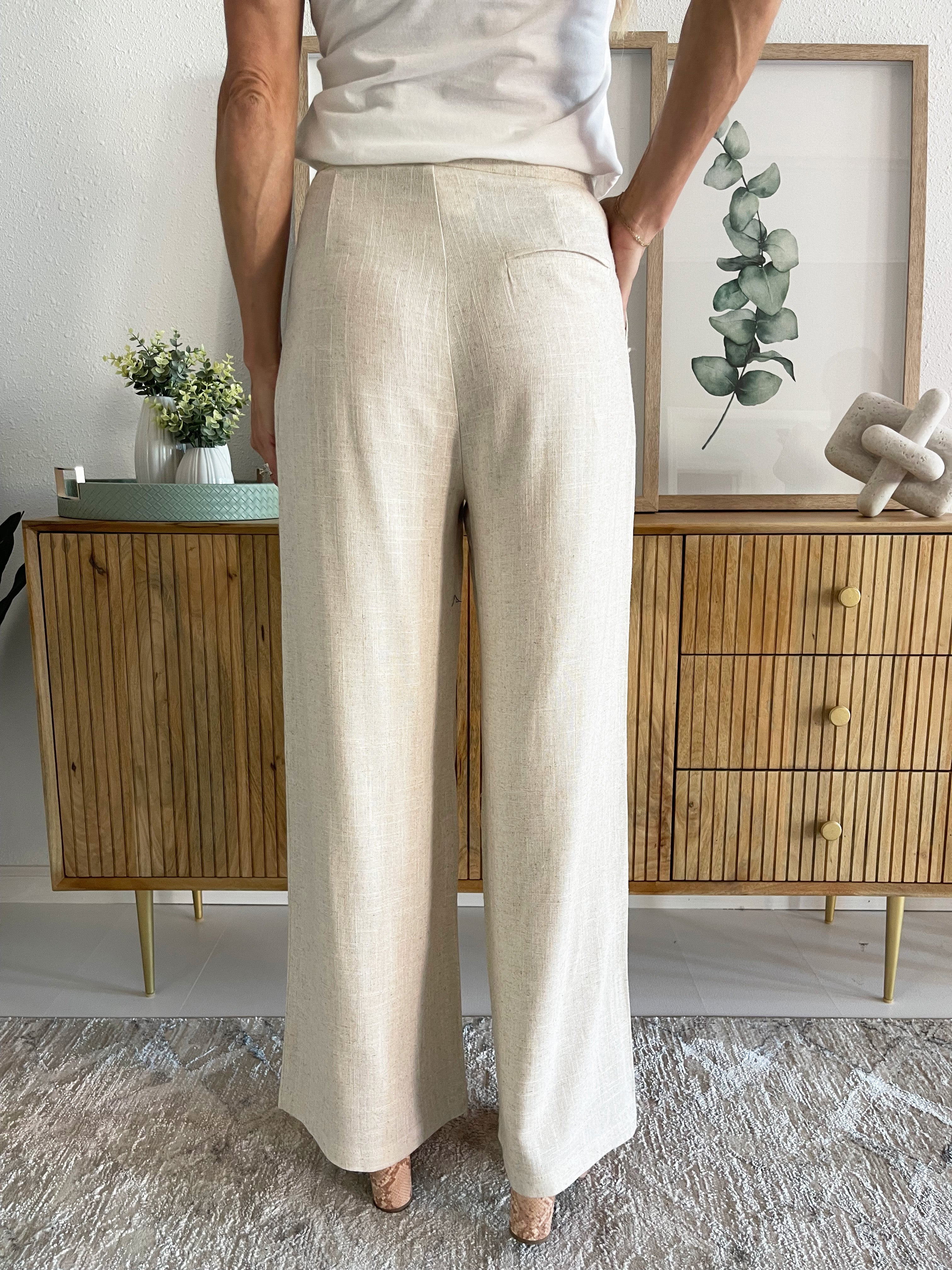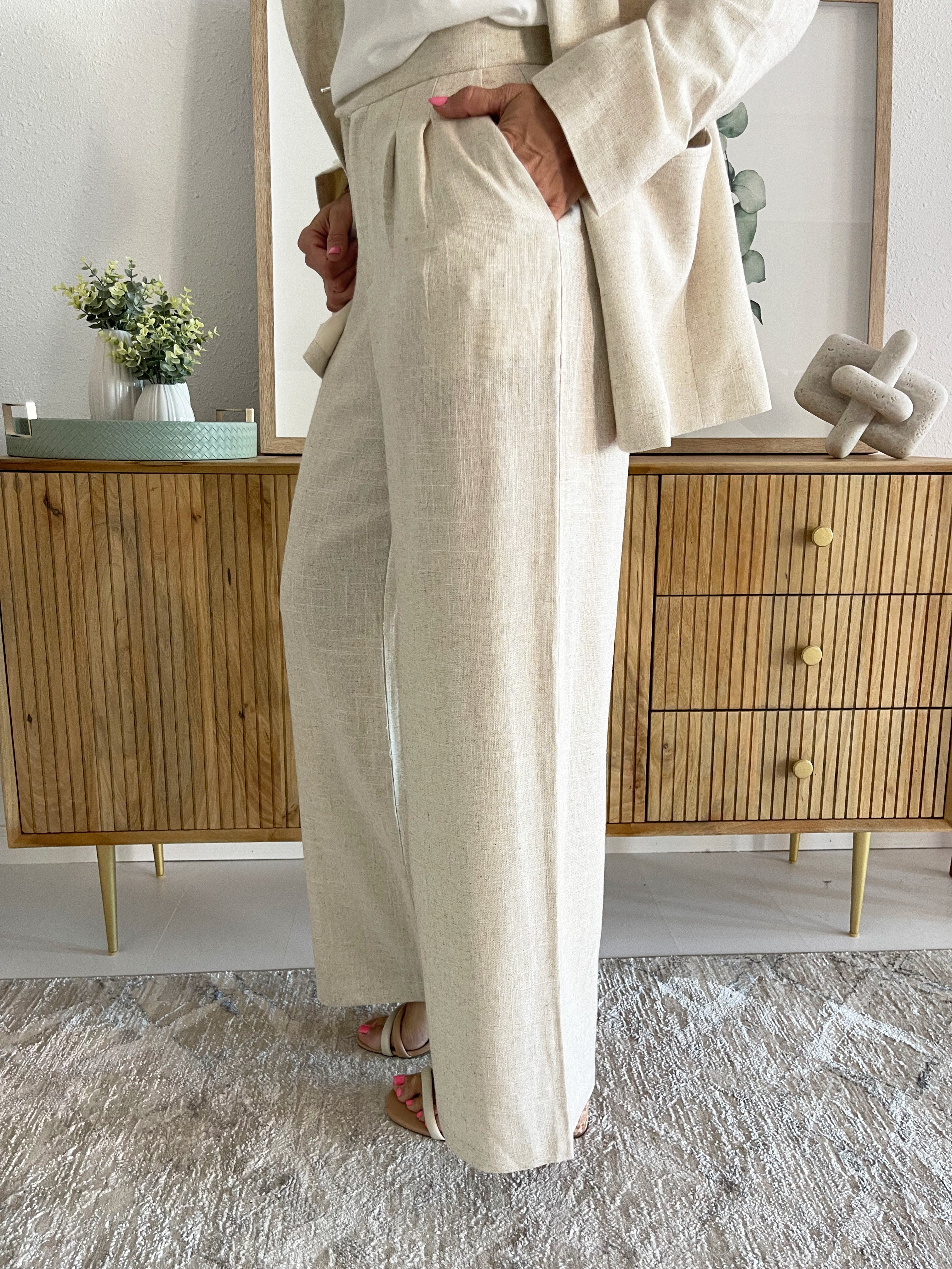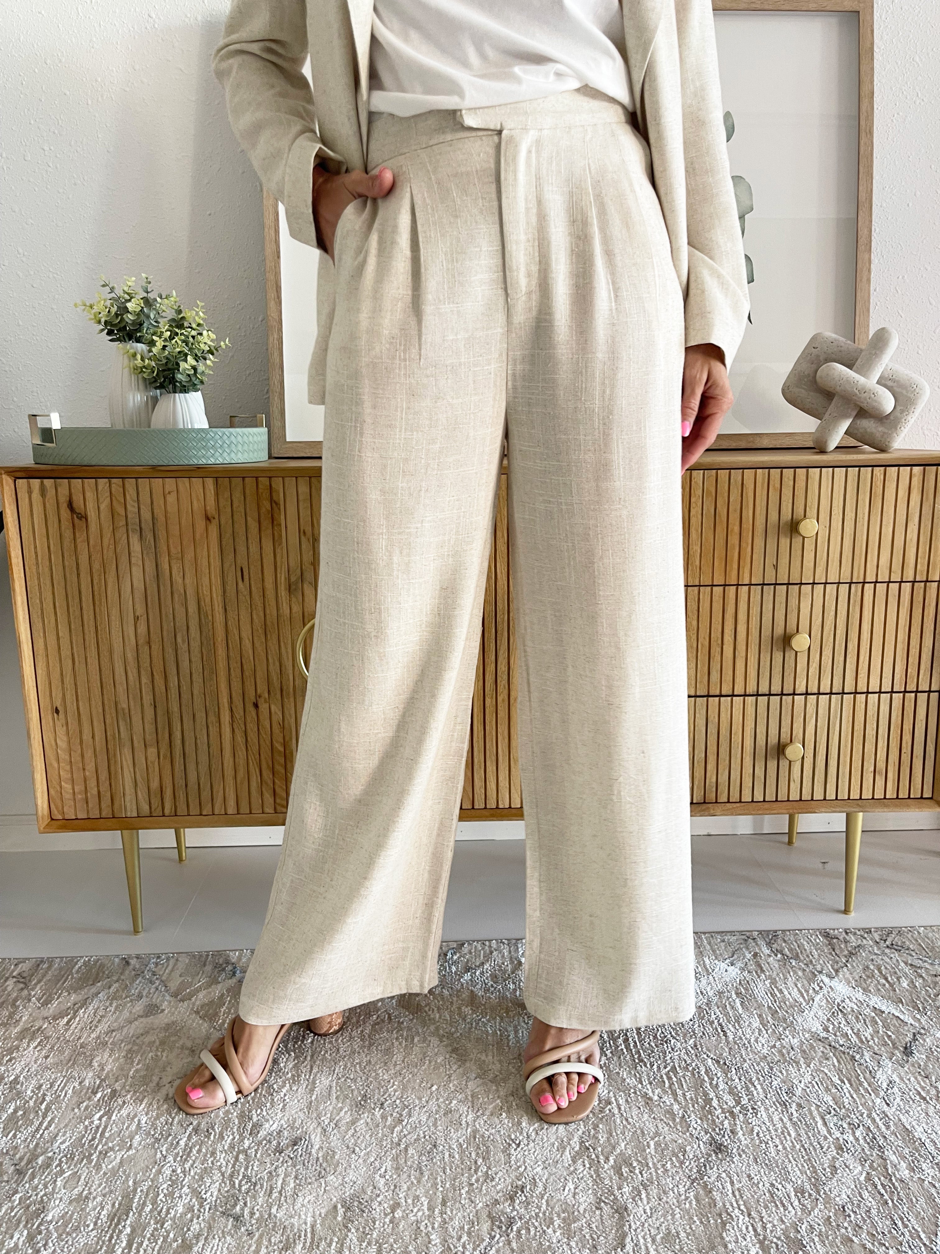 The Woven Wide Leg Trouser is lightweight and full length. Style these linen pants easily with your favorite basics or dress them up with the matching blazer and vest!