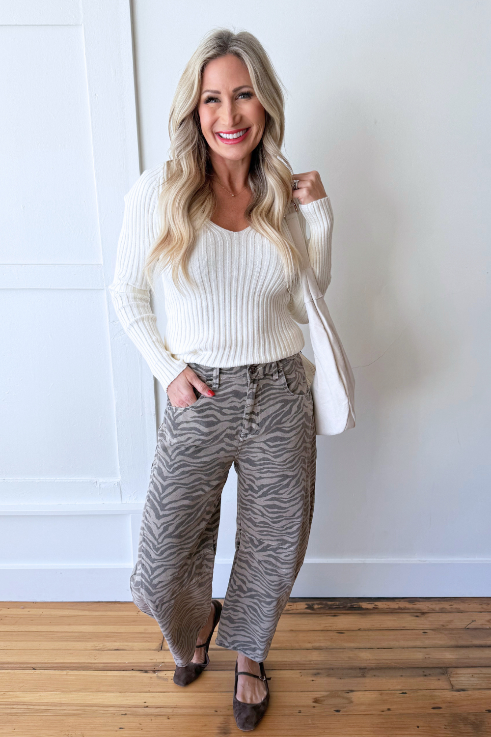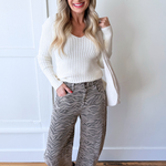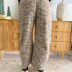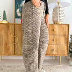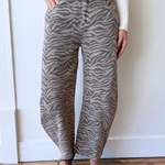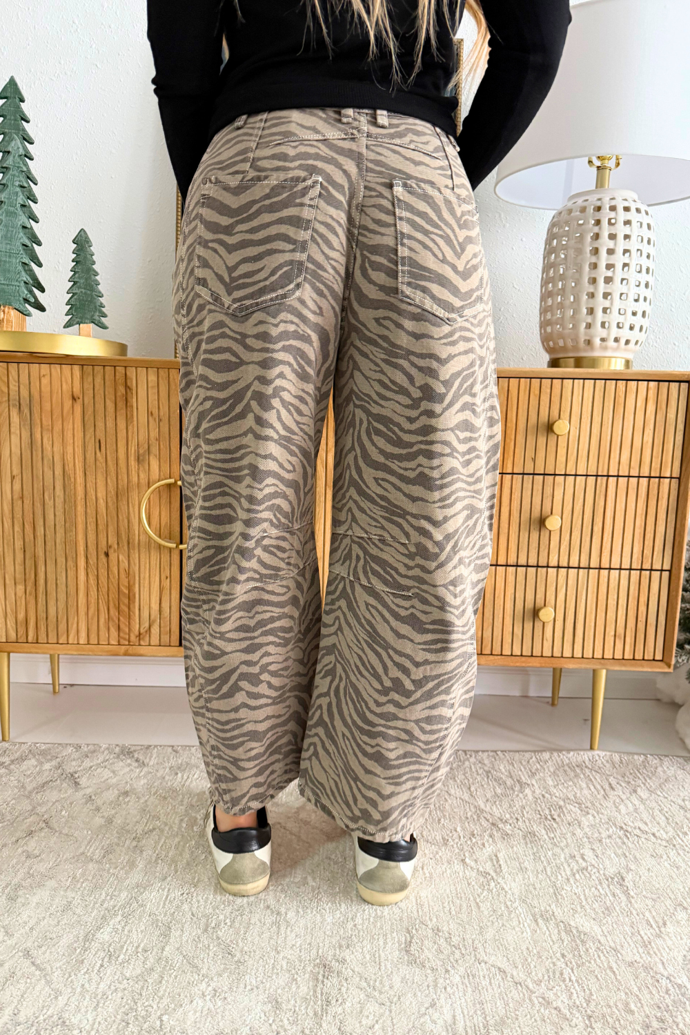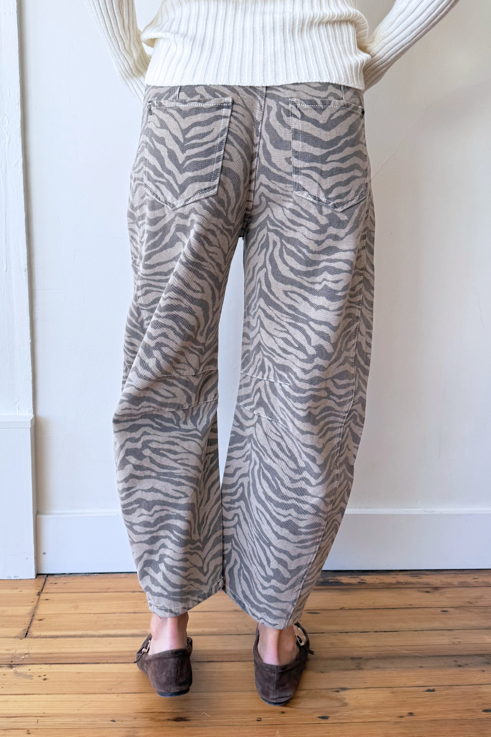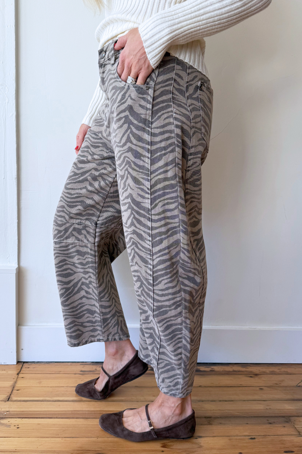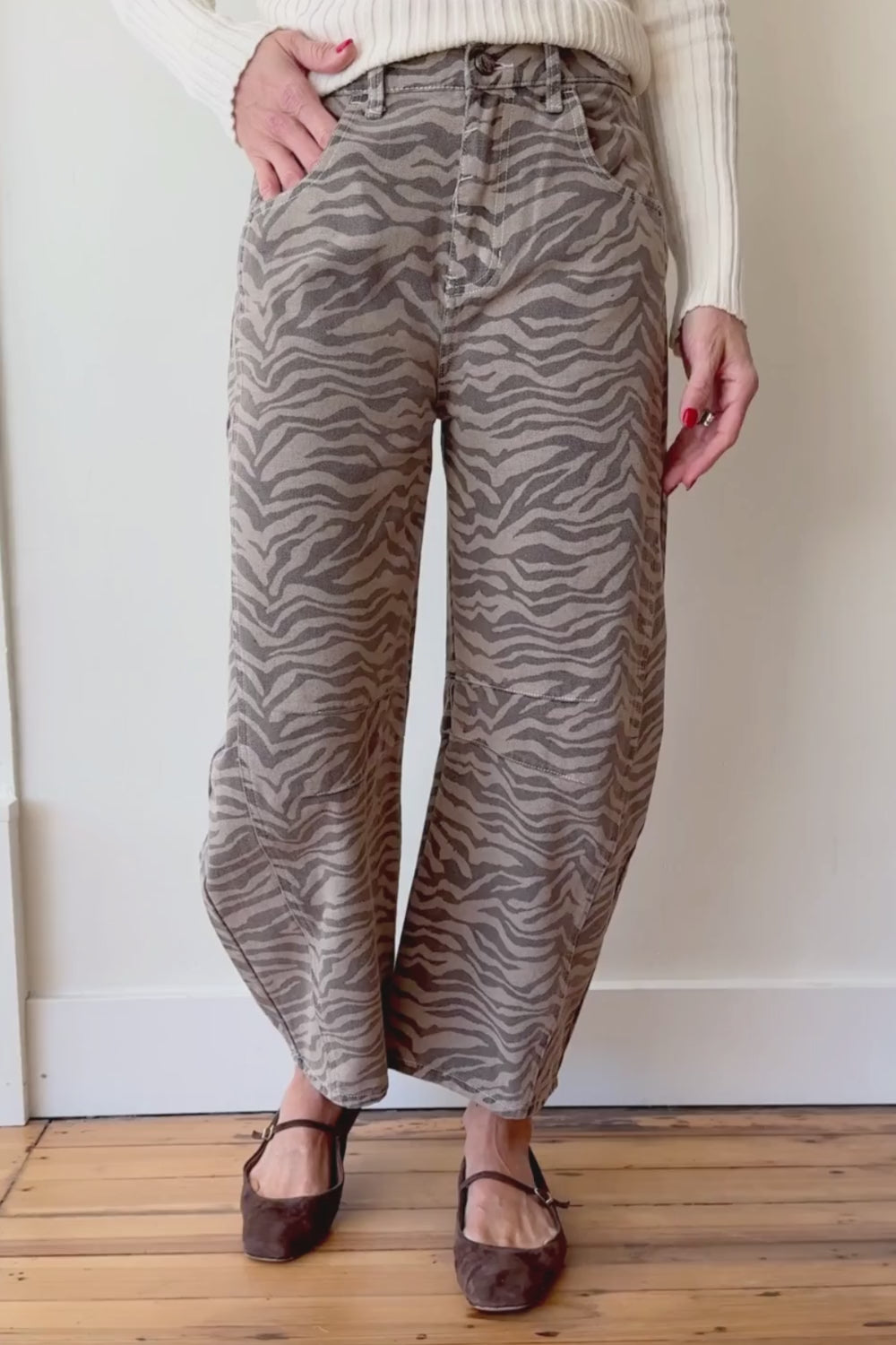 These zebra print barrel jeans make a bold statement with their artistic pattern and modern, sculpted silhouette. Designed with a relaxed fit that tapers at the ankle, they bring an elevated edge to any casual look. Perfect for pairing with simple tops to let the print shine!