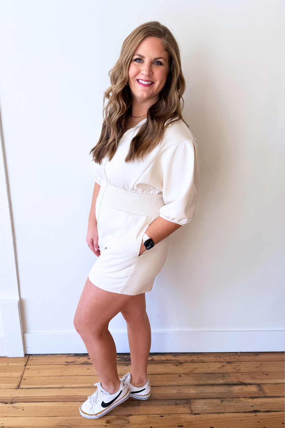 - Alyssa is 5'5" and wears a Medium/8 (Ecru)