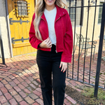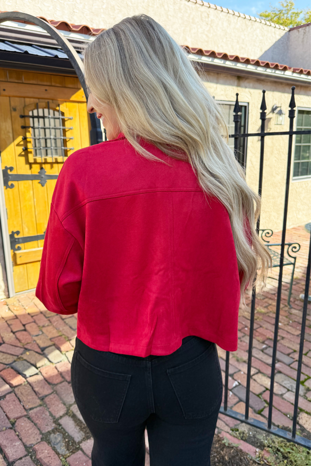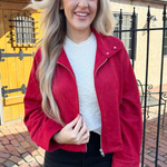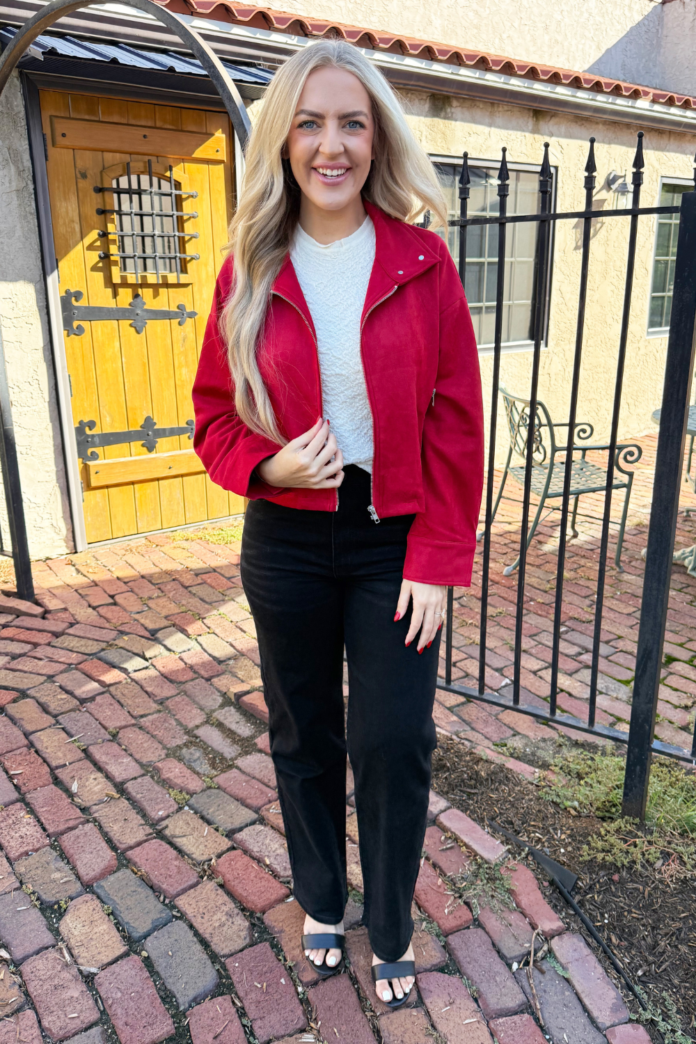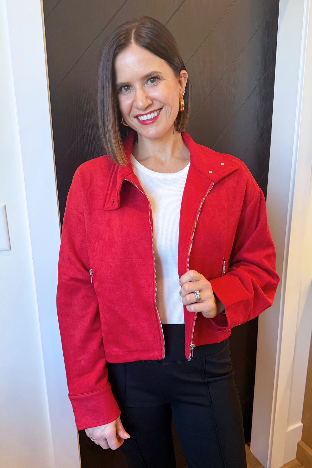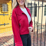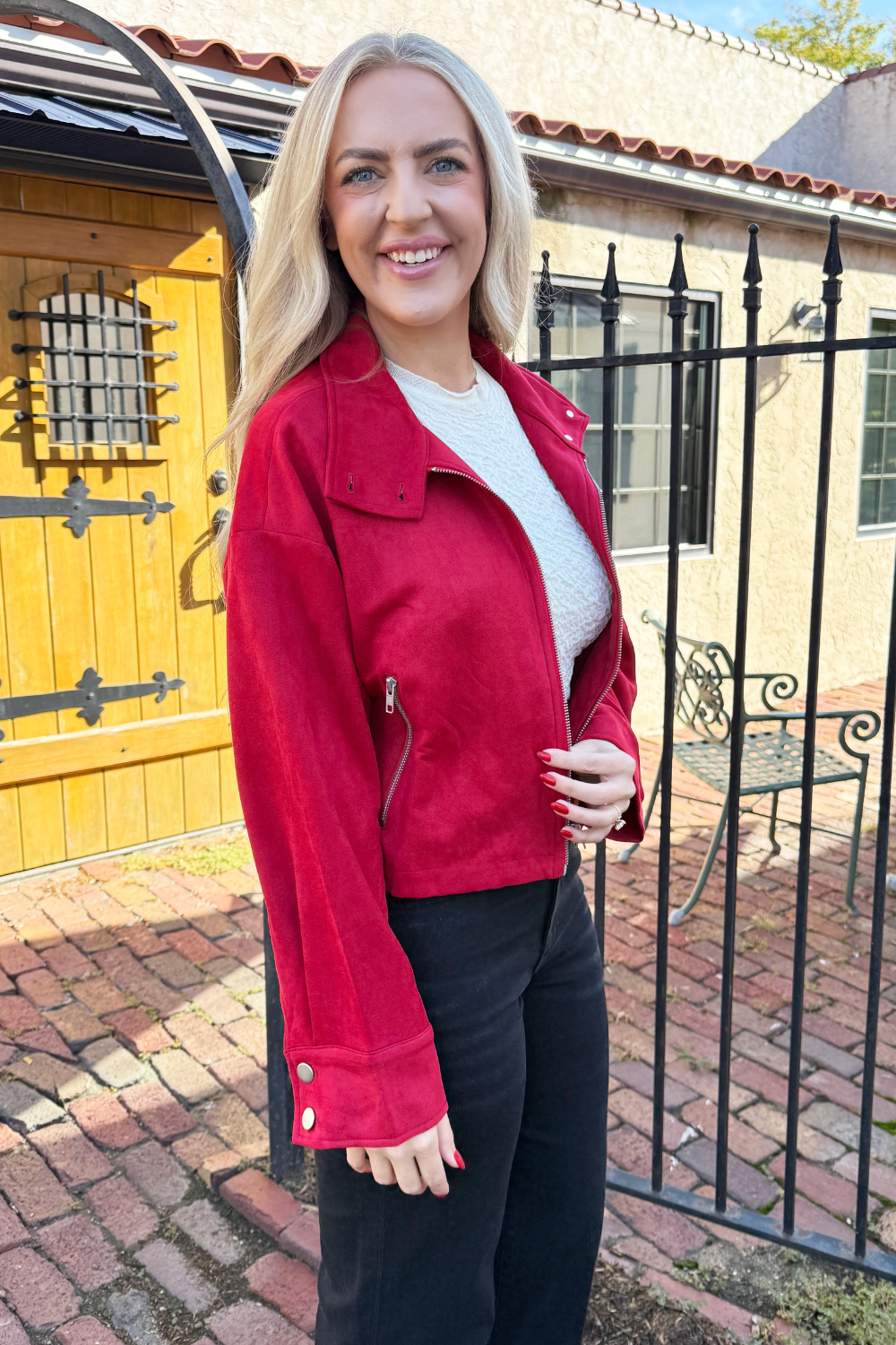 This suede jacket features a classic collar and sleek sip-front closure, combining timeless style with a modern edge. The soft, luxe suede adds a rich texture, making it the perfect statement layer for cooler days! Pair with a graphic tee and your favorite denim for an easy outfit!